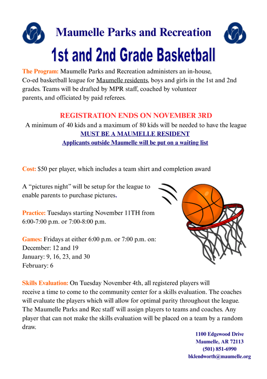 Maumelle Parks and Recreation is excited to offer an in-house co-ed basketball league for 1st and 2nd graders! Teams will be drafted by staff, coached by volunteer parents, and officiated by paid referees.